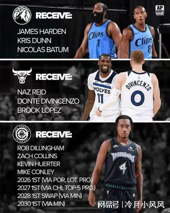 目前,快船以5胜13负的战绩排在西部第13,27%的胜率也创造了快船近15年来最差战绩。今日,美国体育媒体《APHoops》建议快船应该转型重建,并给出了一笔三方交易方案,具体为快船得到迪林厄姆、扎克柯林斯、赫尔特、迈克康利、26年&27年&30年首轮、28年首轮互换;公牛得到纳兹里德、迪温琴佐和大洛佩兹;森林狼得到哈登、邓恩、巴图姆。
