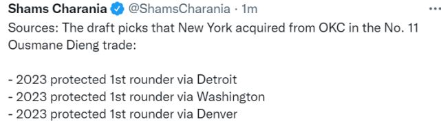 值得一提的是,2022年雷霆为了选中 吉昂,用2023年3个受保护首轮(活塞、奇才和掘金)从尼克斯手中换来了11号签,比杰伦-威还高了一位。