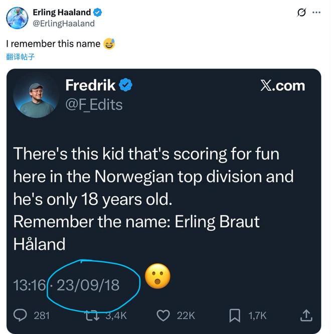 这位名叫弗雷德里克的网友2018年9月23日曾经在社交媒体上发文写道:“现在有个孩子在挪威的顶级联赛以进球为乐,他只有18岁。记住这个名字:埃尔林-布劳特-哈兰德。”